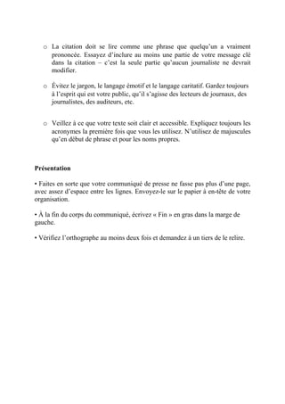 Un communiqué de presse efficace doit commencer par un titre accrocheur et une introduction informant sur l'histoire principale. Il doit suivre une structure pyramidale, en fournissant les informations les plus importantes en premier, et inclure des citations et des informations de contact. Le style doit être clair, accessible, et exempt de jargon, avec une présentation soignée ne dépassant pas une page.