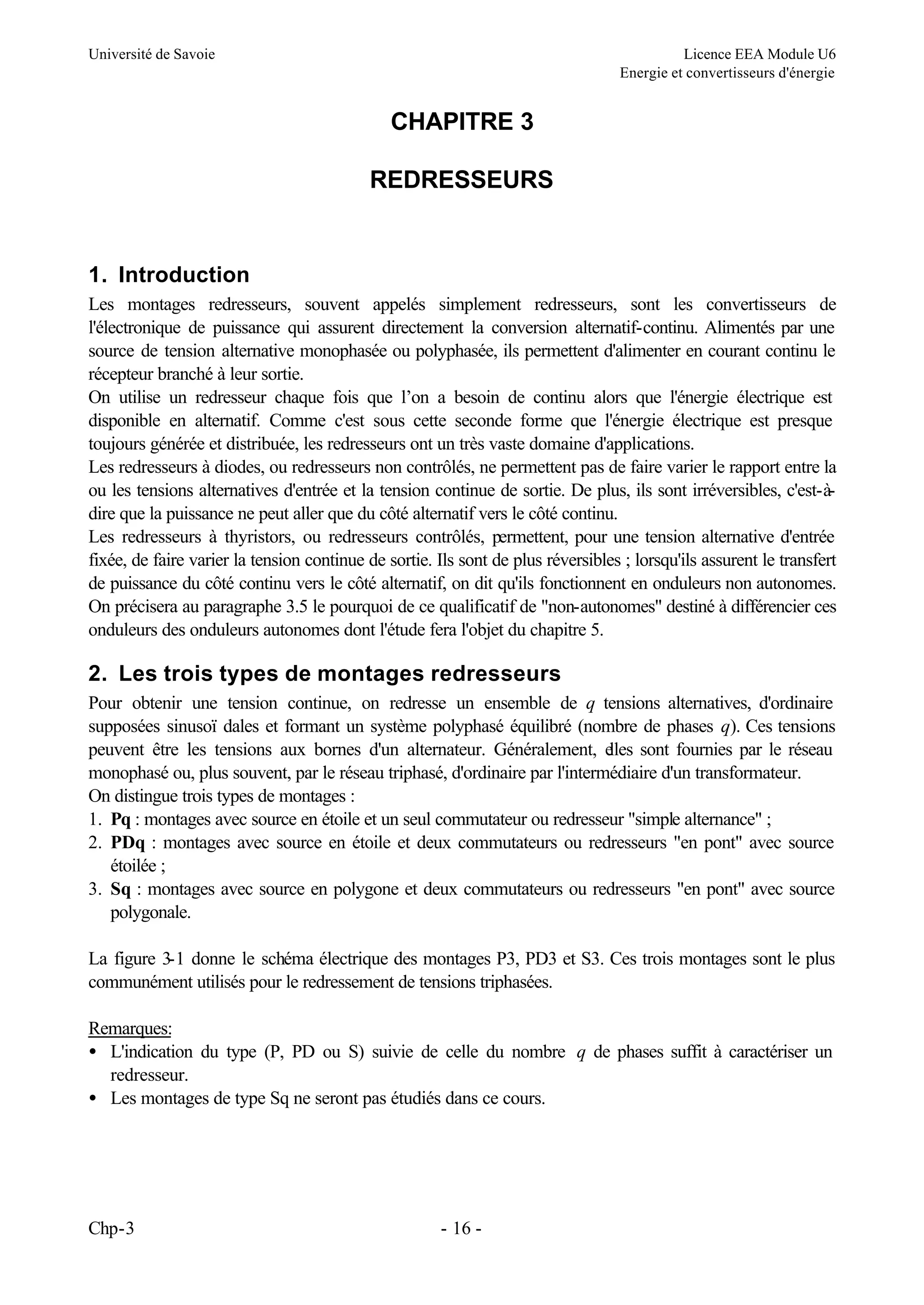 Le chapitre traite des redresseurs, dispositifs essentiels en électronique de puissance pour convertir le courant alternatif en courant continu, en soulignant les types de montages et les techniques de commutation. Il différencie les redresseurs contrôlés et non contrôlés, décrit les principales configurations de montage et introduit les concepts de facteur de forme et de commutation. Les étapes pour analyser un montage redresseur, y compris l'étude des tensions, courants et chutes de tension, sont également couvertes.