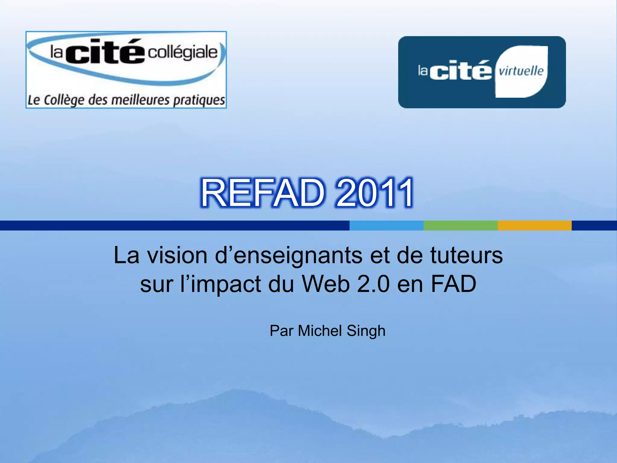 Le document présente les impacts du web 2.0 sur la formation à distance (FAD) selon des enseignants et des tuteurs. Sept impacts majeurs sont identifiés, notamment l'élévation des attentes des étudiants, l'accès illimité aux ressources, et des modèles d'apprentissage qui favorisent la collaboration et le partage. Il souligne également les défis comme le plagiat croissant et l'évolution des méthodes d'enseignement pour s'adapter aux nouvelles technologies.