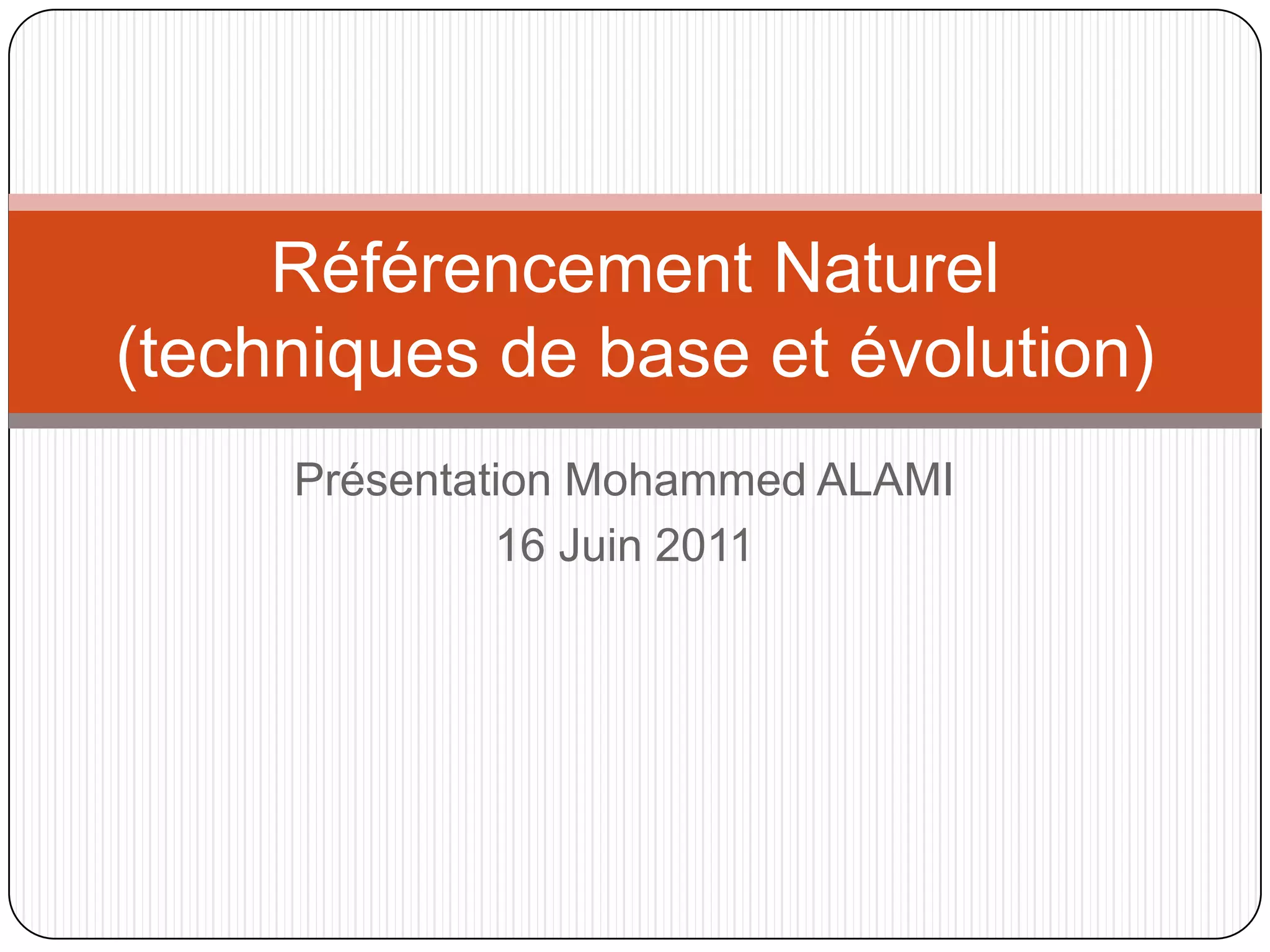 La présentation de Mohammed Alami sur le référencement naturel aborde son introduction, son évolution de 1990 à 2010, et des techniques spécifiques, incluant les meilleures pratiques pour optimiser les sites Web. Elle souligne l'importance du Web 3.0 et du web sémantique, ainsi que l'impact croissant des recherches personnalisées et des médias sociaux sur le référencement. Enfin, elle discute des nouveaux outils d'analyse et des perspectives d'évolution dans le domaine du référencement.