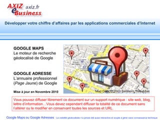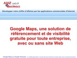 Le document fournit des informations sur Google Maps en tant qu'outil de référencement gratuit pour les entreprises, notamment sur son fonctionnement et ses critères de classement des résultats de recherche locaux. Il décrit également les différentes options de référencement disponibles, les étapes d'inscription, et l'importance d'optimiser la visibilité en ligne à travers des éléments comme des images et des descriptions. Enfin, il encourage les entreprises à s'impliquer sur Google Maps pour rester compétitives dans un environnement en constante évolution.