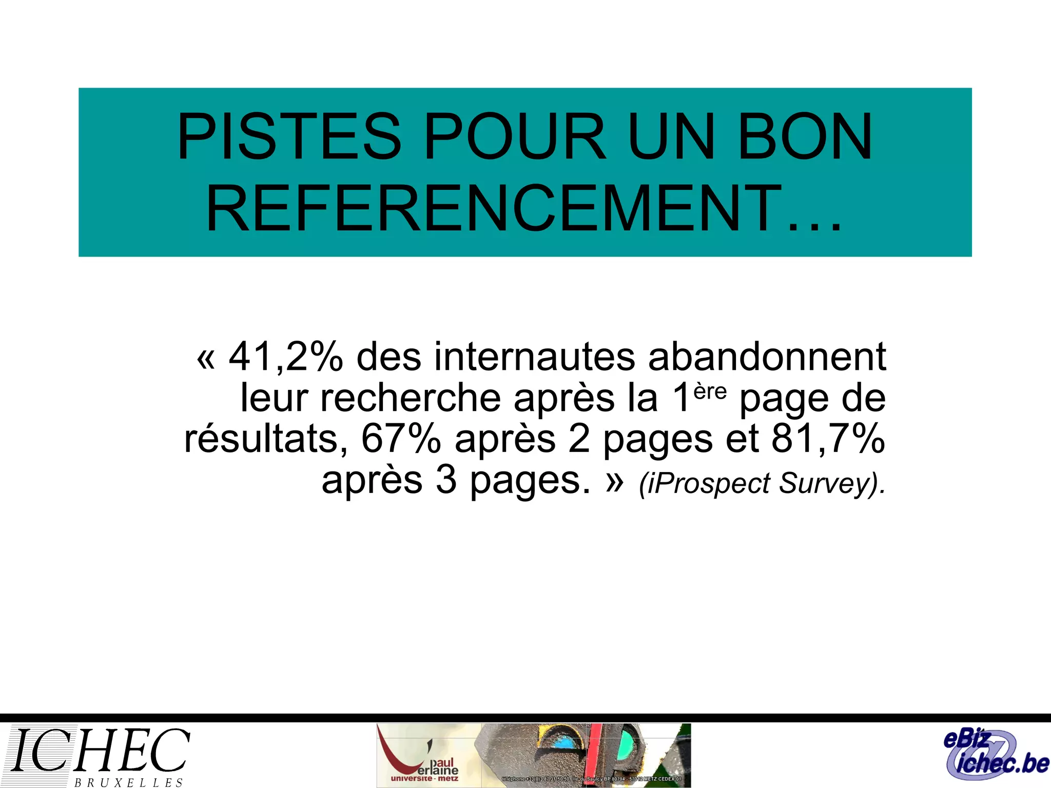 Le document traite des enjeux et stratégies du référencement web, soulignant l'importance d'optimiser un site pour les moteurs de recherche afin d'attirer des visiteurs et potentiellement des clients. Il aborde également les conditions nécessaires pour un bon référencement, notamment la compréhension des utilisateurs, la qualité du contenu, et l'analyse des concurrents. Enfin, il met en garde contre les dépendances aux changements d'algorithmes et la nécessité d'une approche équilibrée entre référencement naturel et payant.