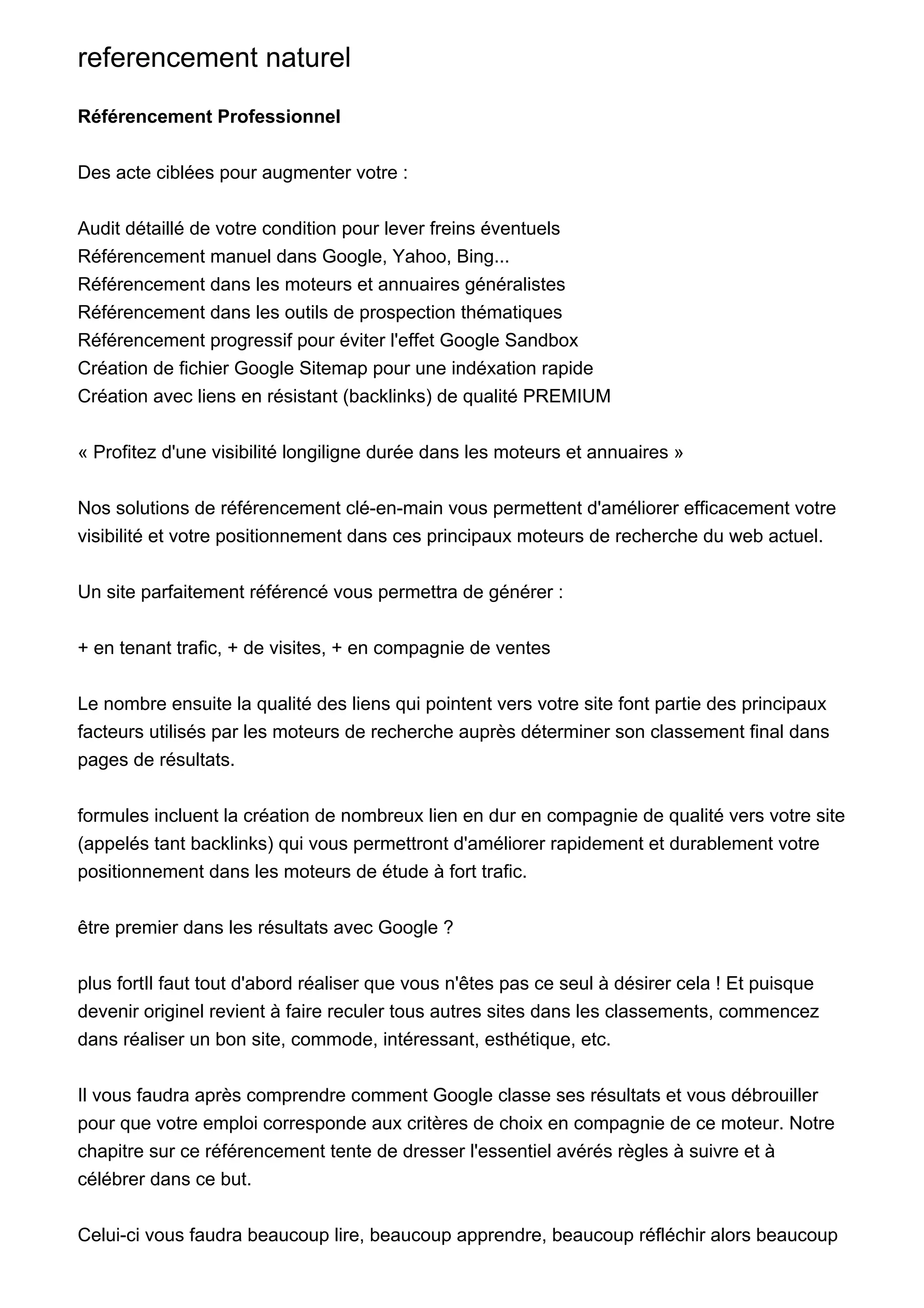 Le document présente des solutions de référencement naturel et payant pour améliorer la visibilité des sites web sur des moteurs de recherche comme Google, Yahoo et Bing. Il souligne l'importance de la création de backlinks de qualité et de la nécessité de travailler sur le contenu et l'esthétique du site pour atteindre un bon classement, tout en précisant qu'un bon référencement prend du temps et peut nécessiter l'aide de professionnels. Enfin, il mentionne que le référencement naturel et payant sont complémentaires pour les résultats dans les classements de recherche.