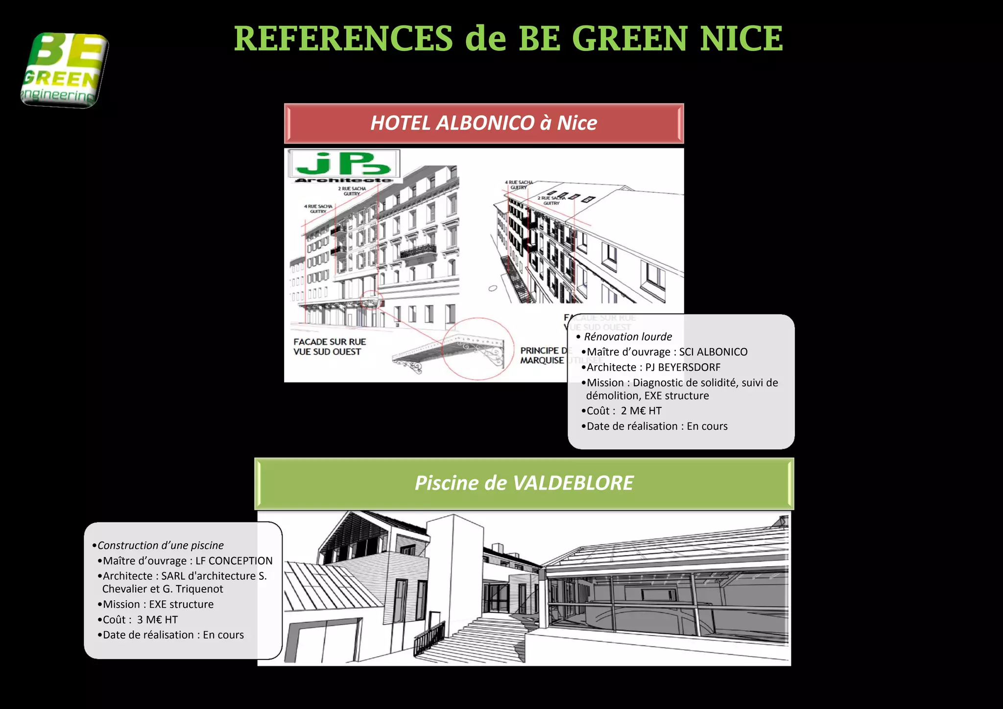 Le document présente plusieurs projets de construction et de rénovation en cours ou réalisés, incluant des hôtels, des piscines, des complexes commerciaux et des logements. Chaque projet indique le maître d'ouvrage, l'architecte, les missions et les coûts associés. Parmi les projets, on retrouve le restaurant à Nice, une piscine à Valdeblore, et une rénovation à Marseille.