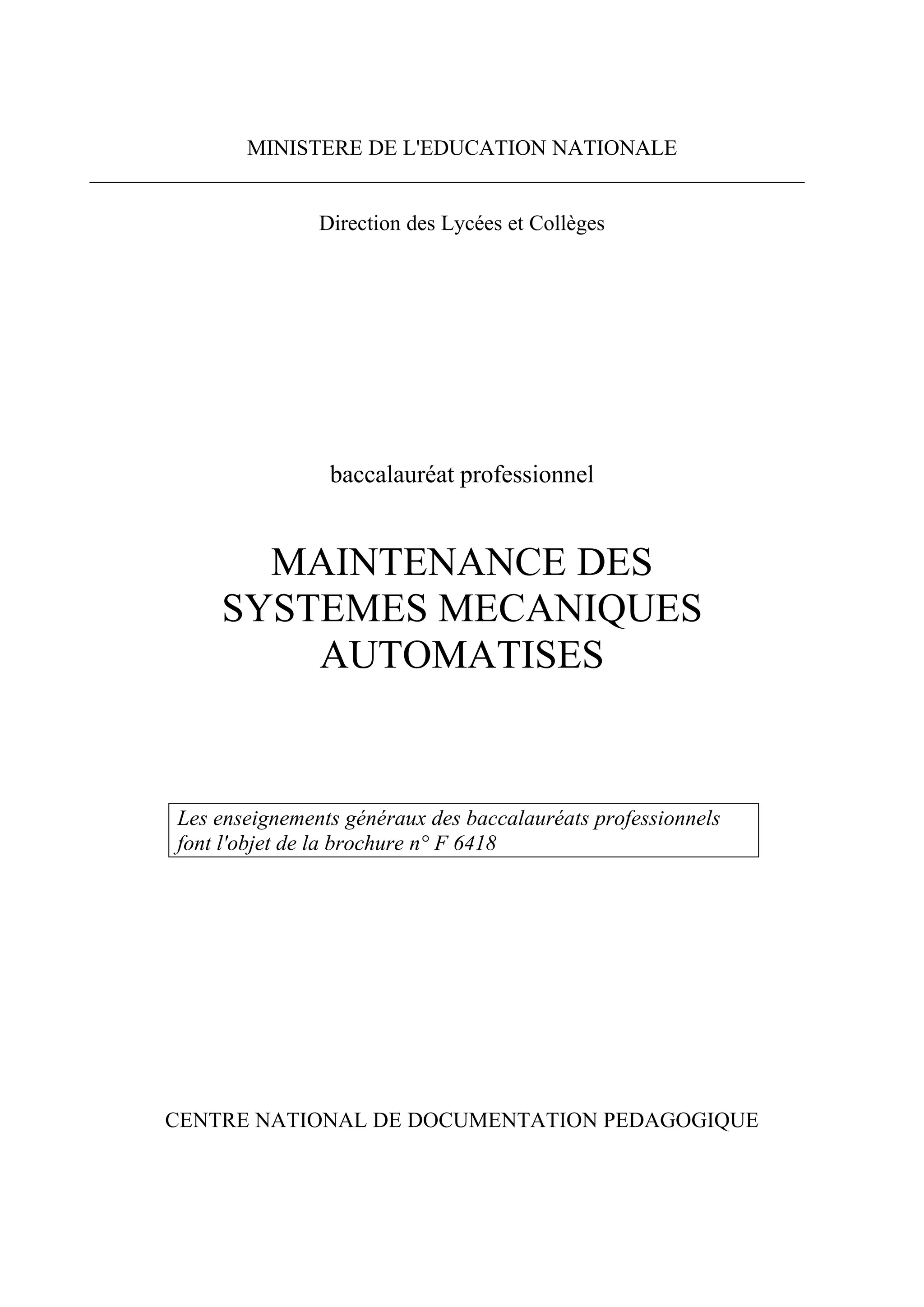 Le document décrit le cadre réglementaire du baccalauréat professionnel en maintenance des systèmes mécaniques automatisés, y compris les référentiels des diplômes, les conditions d'admission et la structure des épreuves. Il précise également les modalités de préparation, tant par voie scolaire que par apprentissage ou formation professionnelle continue. Enfin, il souligne l'importance d'un référentiel actualisé pour garantir la qualification professionnelle des titulaires du diplôme.