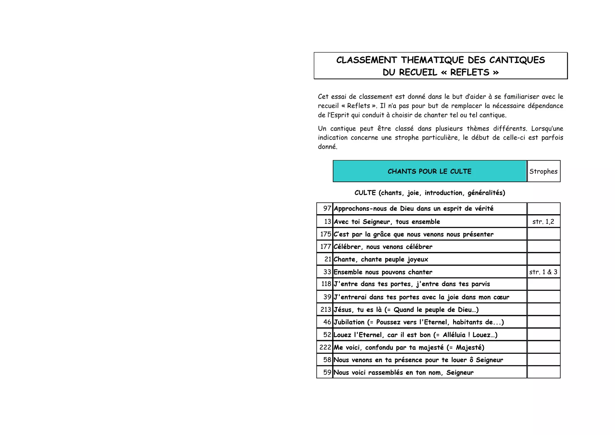 Cet essai propose un classement thématique des cantiques du recueil 'Reflets' pour aider à leur utilisation lors des cultes. Les cantiques sont regroupés par thèmes tels que la louange, la communion avec Dieu et la résurrection, avec des indications pour certaines strophes. Ce classement vise à faciliter le choix des chants sans remplacer la dépendance spirituelle dans la sélection des cantiques.