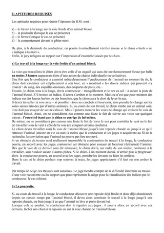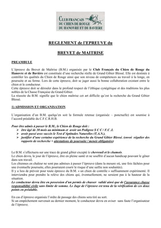 Le règlement de l'épreuve du brevet de maîtrise (b.m.) pour les chiens de rouge du hanovre et de bavière précise les critères de sélection, les aptitudes requises et les modalités d'évaluation lors de la recherche de grand gibier blessé. Les chiens doivent être en bonne santé, avoir un pedigree valide et réussir un test d'aptitudes naturelles, tandis que leur performance est notée dans quatre disciplines : travail à la longe, poursuite, ferme et comportement devant le gibier mort. Les résultats de l'épreuve sont consignés, et des récompenses sont attribuées en fonction de la performance du chien.