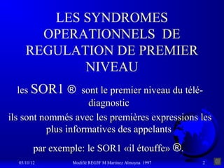 Le document traite des syndromes opérationnels de régulation de premier niveau (SOR1) dans le cadre des interventions du SAMU, en se concentrant sur les accidents et agressions externes. Il souligne l'importance de l'alerte et de la transmission d'informations aux services compétents, ainsi que l'impact psychologique de ces situations sur les témoins et les victimes. Des stratégies d'intervention et de réponse en cas d'accidents collectifs et d'événements dangereux sont également abordées.