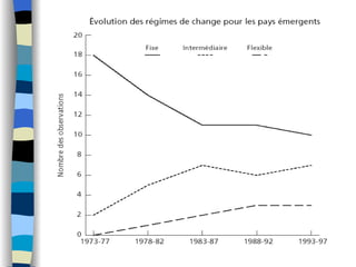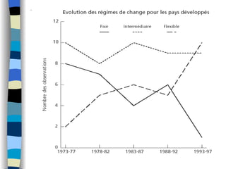Le document traite des régimes de change, en particulier des systèmes fixes et flottants, et examine les avantages et inconvénients de chacun ainsi que leur impact sur l'économie. Il souligne qu'il n'existe pas de régime de change optimal universel, mais que chaque pays doit choisir celui qui sert le mieux ses objectifs économiques. Enfin, le texte évoque des études empiriques qui montrent des divergences dans les effets des différents régimes de change sur la croissance et l'inflation selon le niveau de développement économique des pays.