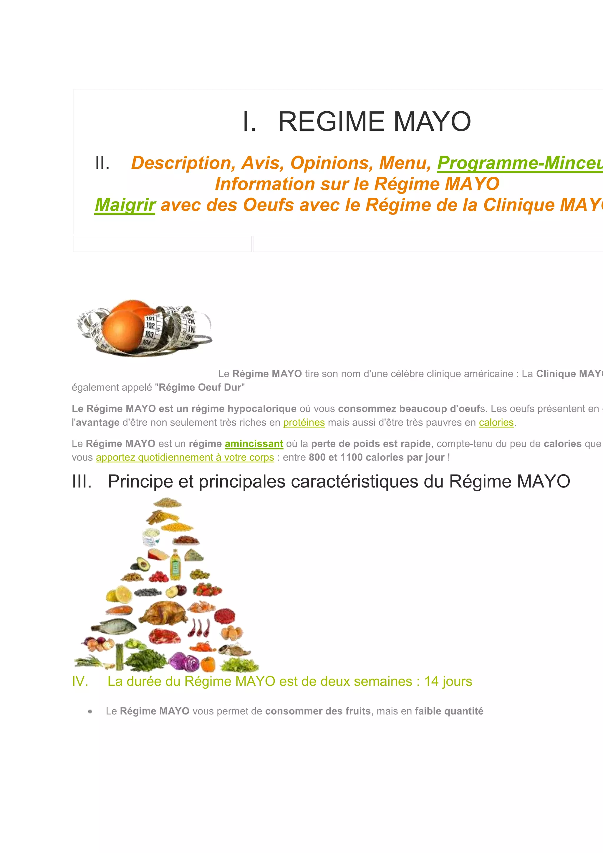 Le régime Mayo est un régime hypocalorique, également connu sous le nom de régime œuf dur, qui consiste à consommer entre 800 et 1100 calories par jour, principalement des œufs. Il dure deux semaines et permet une perte de poids rapide, tout en interdisant les lipides, glucides, féculents et produits laitiers. Les repas incluent une grande quantité d'œufs, des fruits en faible quantité et des boissons comme le thé, le café et l'eau.