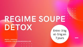 Le régime soupe détox promet une perte de poids de 3 à 5 kg en 7 jours en consommant des soupes diurétiques et faibles en calories, tout en recommandant de suivre un menu précis. Ce régime, élaboré par des médecins américains, doit être associé à une alimentation équilibrée pour éviter les carences et ne doit pas être prolongé au-delà d'une semaine. Une attention particulière est requise concernant l'hydratation et l'évitement d'alcool et de sucres après le régime.