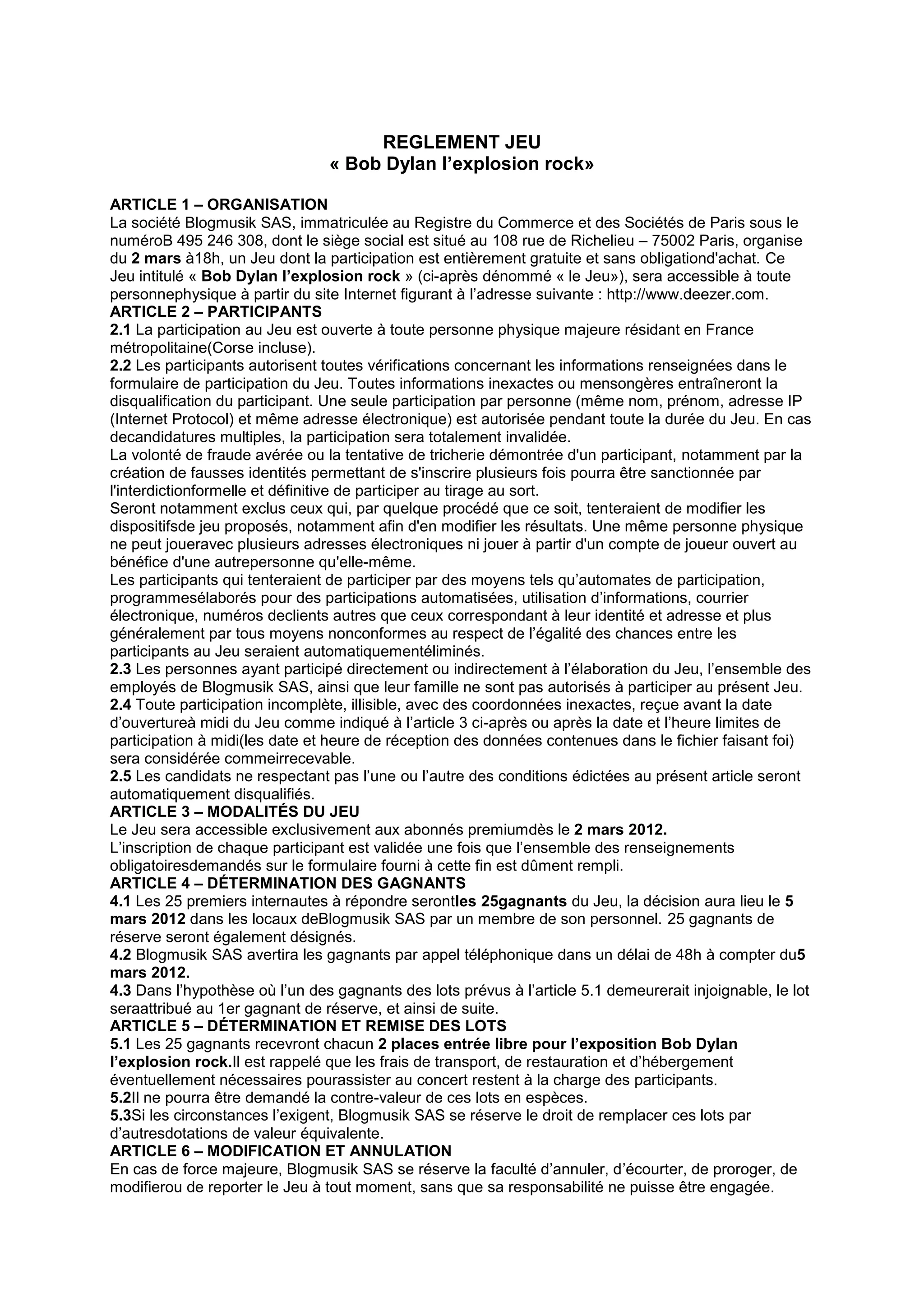 La société Blogmusik SAS organise un jeu gratuit intitulé 'Bob Dylan l'explosion rock' accessible à toute personne physique majeure résidant en France métropolitaine, à partir du 2 mars 2012. Les participants doivent remplir un formulaire et une seule participation est autorisée par personne, avec des vérifications possibles des informations fournies. Les 25 premiers participants à répondre gagneront des places pour l'exposition, avec des règles spécifiques concernant la délivrance des prix et la responsabilité de l'organisateur en cas de problèmes.
