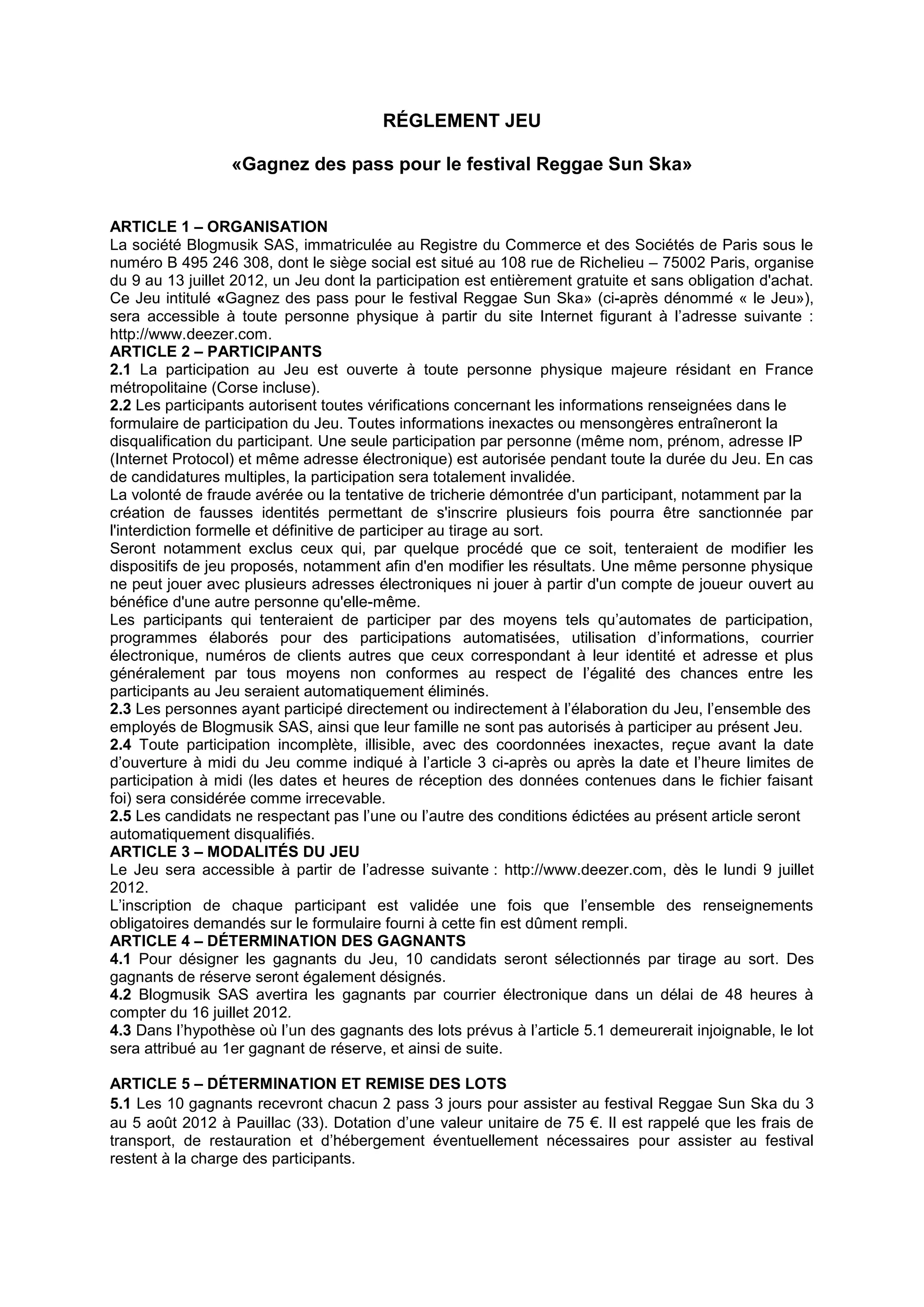 Le jeu 'gagnez des pass pour le festival reggae sun ska', organisé par Blogmusik SAS, se déroule du 9 au 13 juillet 2012, et est ouvert à toute personne physique majeure résidant en France métropolitaine. Dix gagnants seront tirés au sort pour recevoir des pass pour le festival, avec des règles strictes de participation et de vérification des données fournies. Blogmusik SAS se réserve le droit de modifier ou d'annuler le jeu en cas de force majeure, et les participants doivent accepter le règlement pour participer.