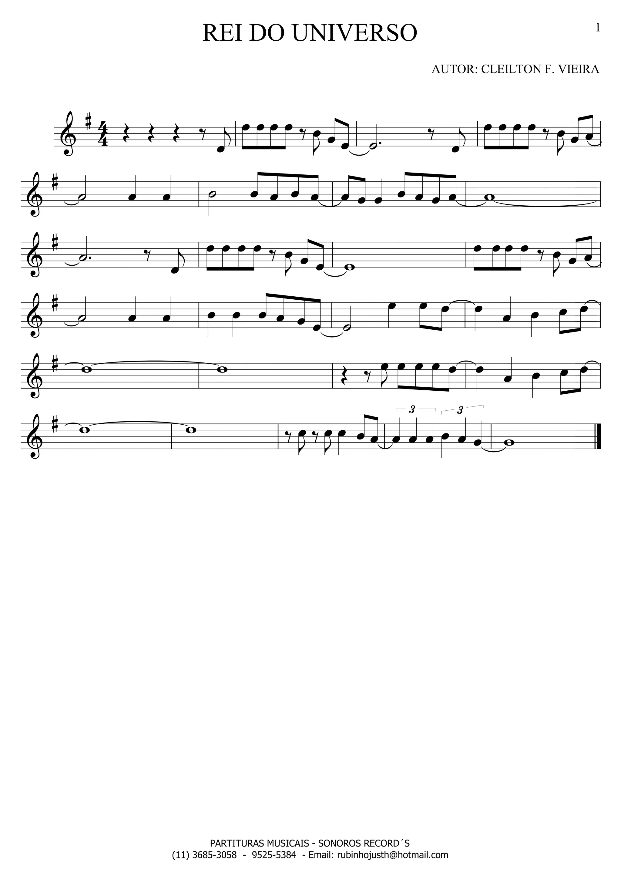 Le document semble être une œuvre musicale d'un auteur nommé Cleilton F. Vieira, évoquant le thème d'un roi de l'univers. Il contient des références à des partitions musicales et des contacts pour des enregistrements sonores. Les détails sont mélangés avec des symboles et du texte peu lisible.