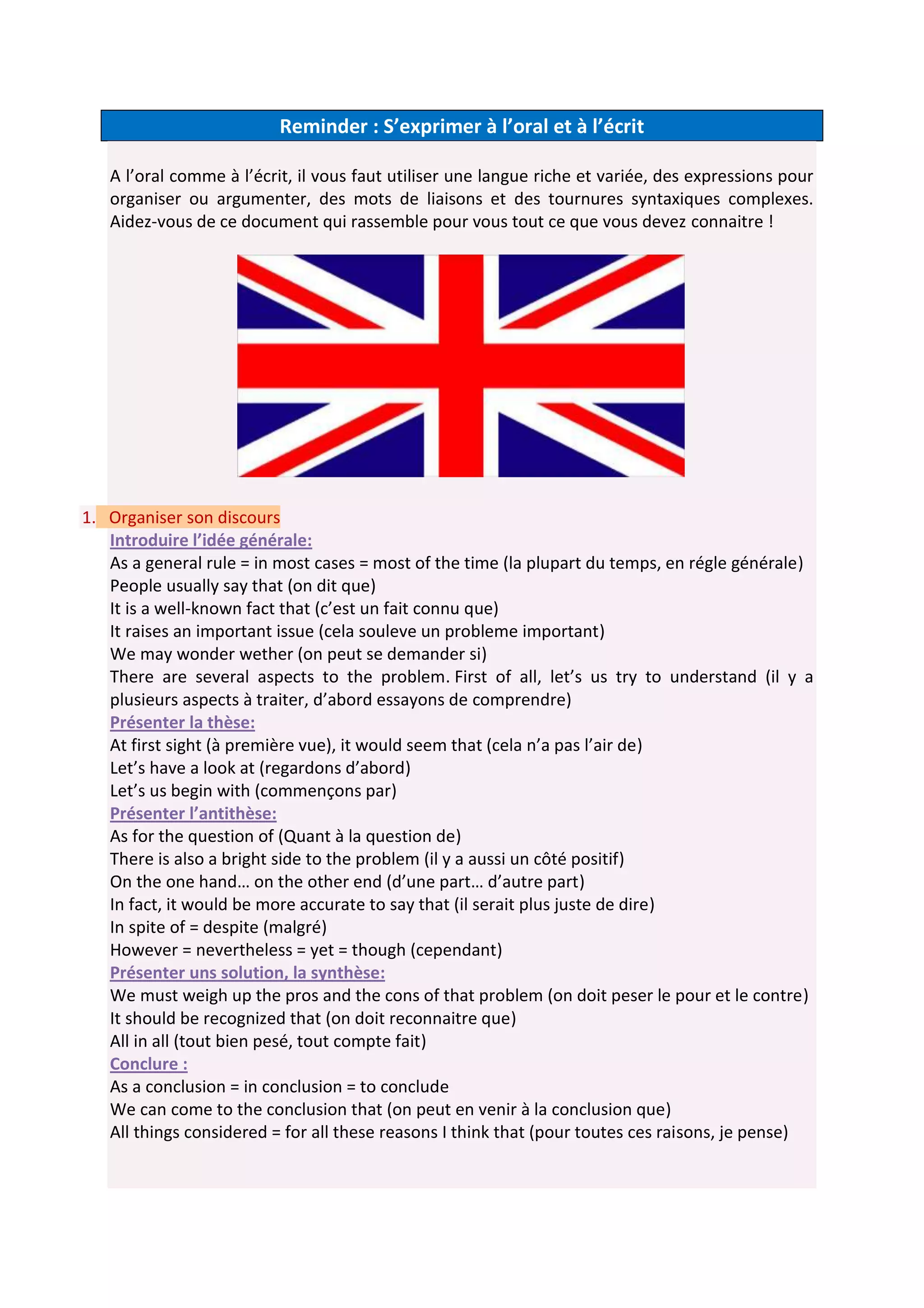 Ce document fournit des expressions et des structures linguistiques essentielles pour améliorer l'expression orale et écrite. Il aborde l'organisation d'un discours, la construction de phrases complexes, et la formulation d'arguments, d'accords ou de désaccords, ainsi que des comparaisons. L'ensemble des outils présentés vise à enrichir la communication en français.