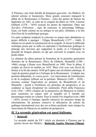 La Renaissance italienne est un tournant artistique et culturel qui s'inspire de l'Antiquité, marquée par la redécouverte des valeurs classiques et l'essor de l'imprimerie. Ce mouvement, centré en Italie, est soutenu par des mécènes influents, comme les Médicis à Florence, et se diffuse à travers l'Europe grâce aux guerres. Des artistes majeurs tels que Léonard de Vinci, Michel-Ange et Titien façonnent cette période, à la fois à travers leurs innovations techniques et leurs réflexions sur la beauté et la condition humaine.