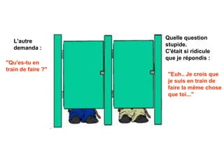 L'histoire se déroule dans des toilettes où une personne engage une conversation inattendue avec un individu dans la cabine voisine. Malgré le caractère inapproprié de la situation, le narrateur répond poliment, mais la conversation devient absurde lorsque l'autre personne propose de le rejoindre. Finalement, cette dernière se plaint d'être dérangée par le narrateur qui répond à ses questions.