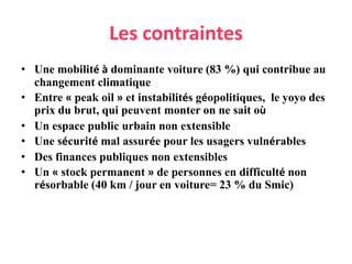 Le document aborde les défis et opportunités de la mobilité actuelle, mettant en lumière la prédominance de la voiture et ses conséquences sur l'environnement, la sécurité et les finances publiques. Il souligne le succès limité des transports en commun et propose des pistes pour repenser la politique de mobilité, centering sur le partage des véhicules et l'utilisation de modes de transport plus urbains et adaptés. En outre, il appelle à une approche régionale et collaborative pour améliorer l'intégration des transports avec l'urbanisme.