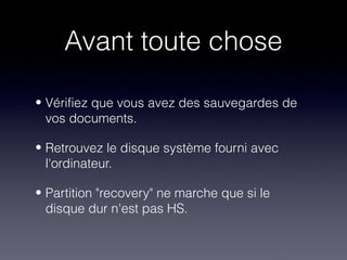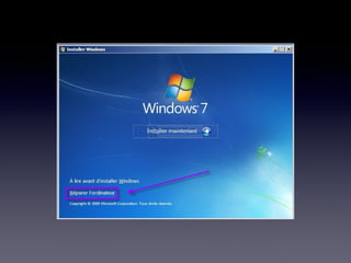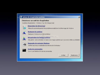 Le document fournit des instructions pour réparer un ordinateur sous Windows 7, en soulignant l'importance de sauvegardes et de l'accès au disque système. Les étapes incluent le redémarrage en mode sans échec, l'utilisation de points de restauration, et des outils de réparation spécifiques. Les options de récupération incluent la réparation du démarrage, la restauration du système, et des diagnostics de mémoire.
