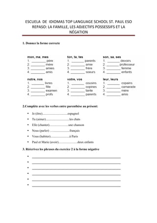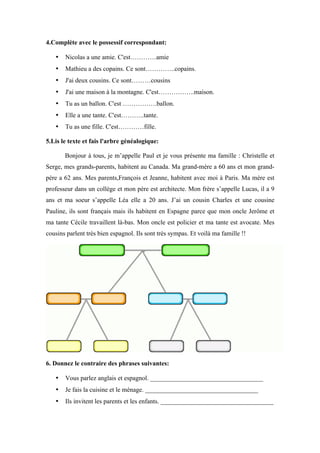 Le document est un exercice de langue destiné aux étudiants, axé sur la famille, les adjectifs possessifs et la négation en français. Il comprend des tâches sur la conjugaison des verbes, la reformulation de phrases et la création d'un arbre généalogique. Les étudiants sont invités à développer leur compréhension et leur utilisation du français à travers différentes activités écrites.