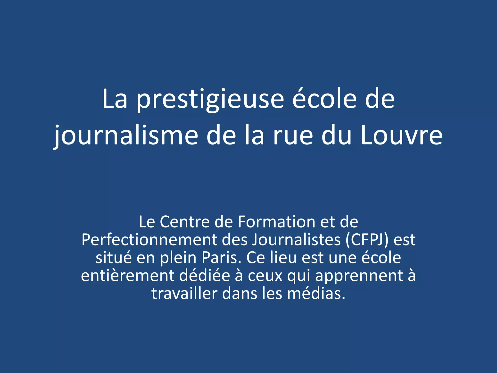 Le Centre de Formation et de Perfectionnement des Journalistes (CFPJ) est situé au 35 rue du Louvre à Paris, offrant un espace dédié à la formation des professionnels des médias. Le bâtiment, bien aménagé et accessible, propose une variété de ressources modernes pour les étudiants, bien que certaines salles manquent d'insonorisation et que les locaux soient parfois exigus. Le CFPJ, créé après la libération, est un lieu historique qui continue d'attirer élèves et professionnels du journalisme.