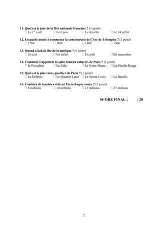 Le document est un questionnaire sur Paris, incluant des questions sur la langue française, les symboles et monuments de la ville, ainsi que des informations historiques et culturelles. Les participants doivent répondre à des questions à choix multiples sur différents aspects de Paris, tels que ses arrondissements, ses musées et le nombre de touristes. Le résultat final est un score sur 20 basé sur les réponses données.