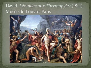 Le document explique l'origine du terme « pompier » dans l'art académique, apparu à la fin du XIXe siècle, lié à des casques brillants des personnages dans de grandes compositions. Plusieurs hypothèses sont proposées, incluant une dérision du mot « pompéien » et une référence à une comédie de 1841. Le terme pourrait également faire allusion aux successeurs de David, en lien avec des œuvres telles que 'Léonidas aux Thermopyles'.