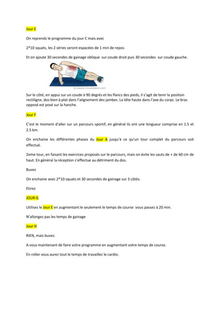 Le document présente un programme d'exercices sur huit jours, incluant des sessions de marche rapide, de course, de squats et de gainage, avec des instructions détaillées pour chaque session. Il encourage également des étirements et des pauses hydratation, ainsi que des suggestions pour rechercher des parcours sportifs. À la fin, il incite à personnaliser le programme en augmentant le temps de course.