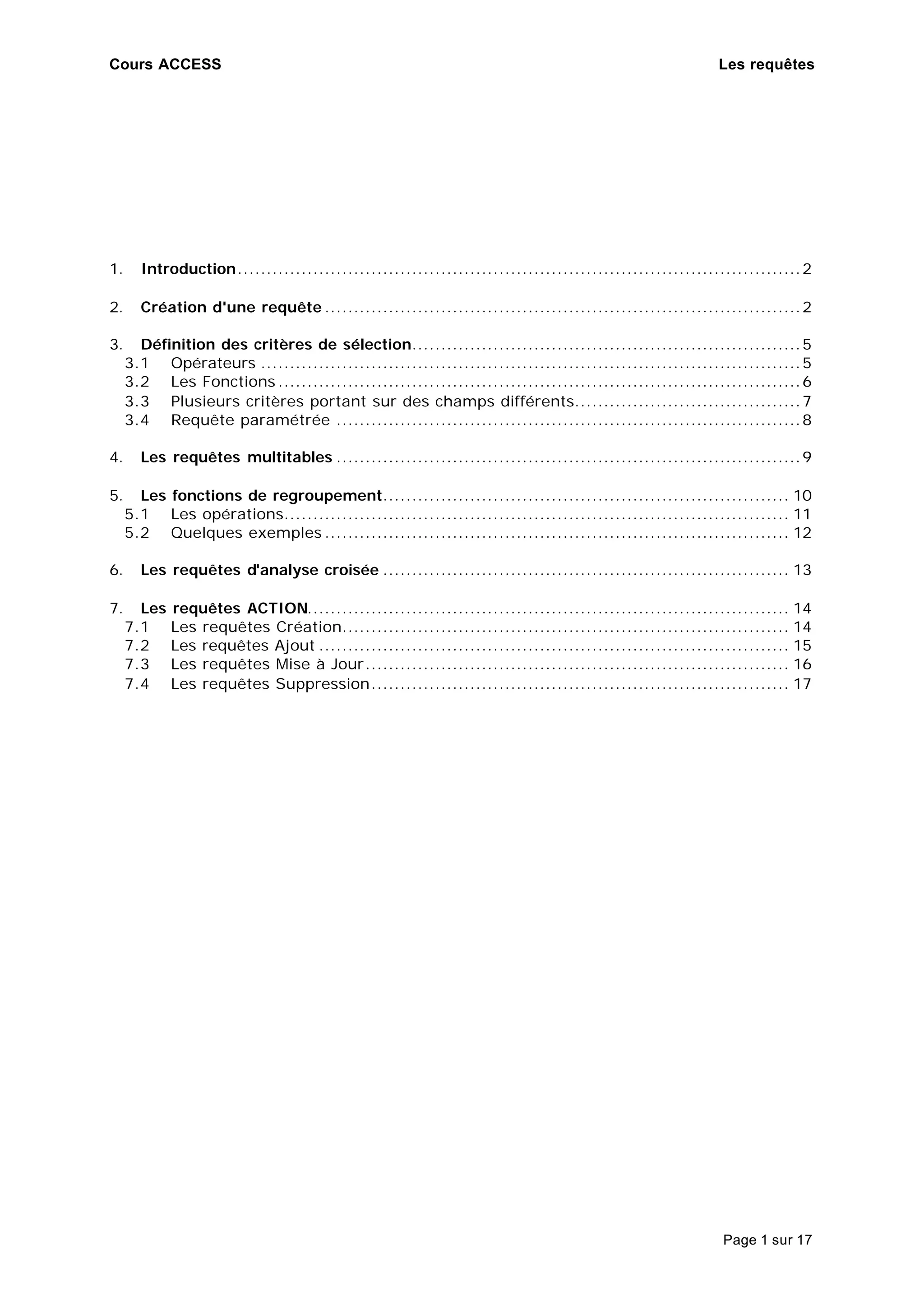 Le document présente une formation sur les requêtes dans Microsoft Access, expliquant comment créer des requêtes pour filtrer, analyser et modifier des données. Il détaille les différents types de requêtes, comme les requêtes de sélection, d'analyse croisée et de mise à jour, ainsi que la manière de définir des critères de sélection et d'utiliser des opérations sur plusieurs tables. Des exemples pratiques sont fournis pour illustrer la création et l'exécution de requêtes, ainsi que l'utilisation de paramètres.