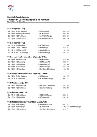 Le document présente les résultats des matchs de handball de la fédération luxembourgeoise pour la période du 7 au 13 octobre 2019. Il inclut les scores de divers matchs pour les catégories masculines et féminines, allant des ligues seniors aux équipes juniors. Les résultats montrent des performances variées des équipes participantes dans plusieurs divisions.