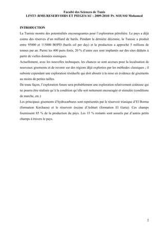La Tunisie possède des ressources pétrolières significatives avec une production de 95 000 à 115 000 barils par jour, principalement provenant des réservoirs d'El Borma et d'Ashtart. Le document présente divers types de réservoirs pétroliers, y compris ceux d'origine gréseuse et carbonatée, ainsi que leurs caractéristiques géologiques et pétrophysiques. Malgré des défis liés à l'exploration coûteuse, les avancées technologiques augmentent les opportunités de découverte de nouveaux gisements.