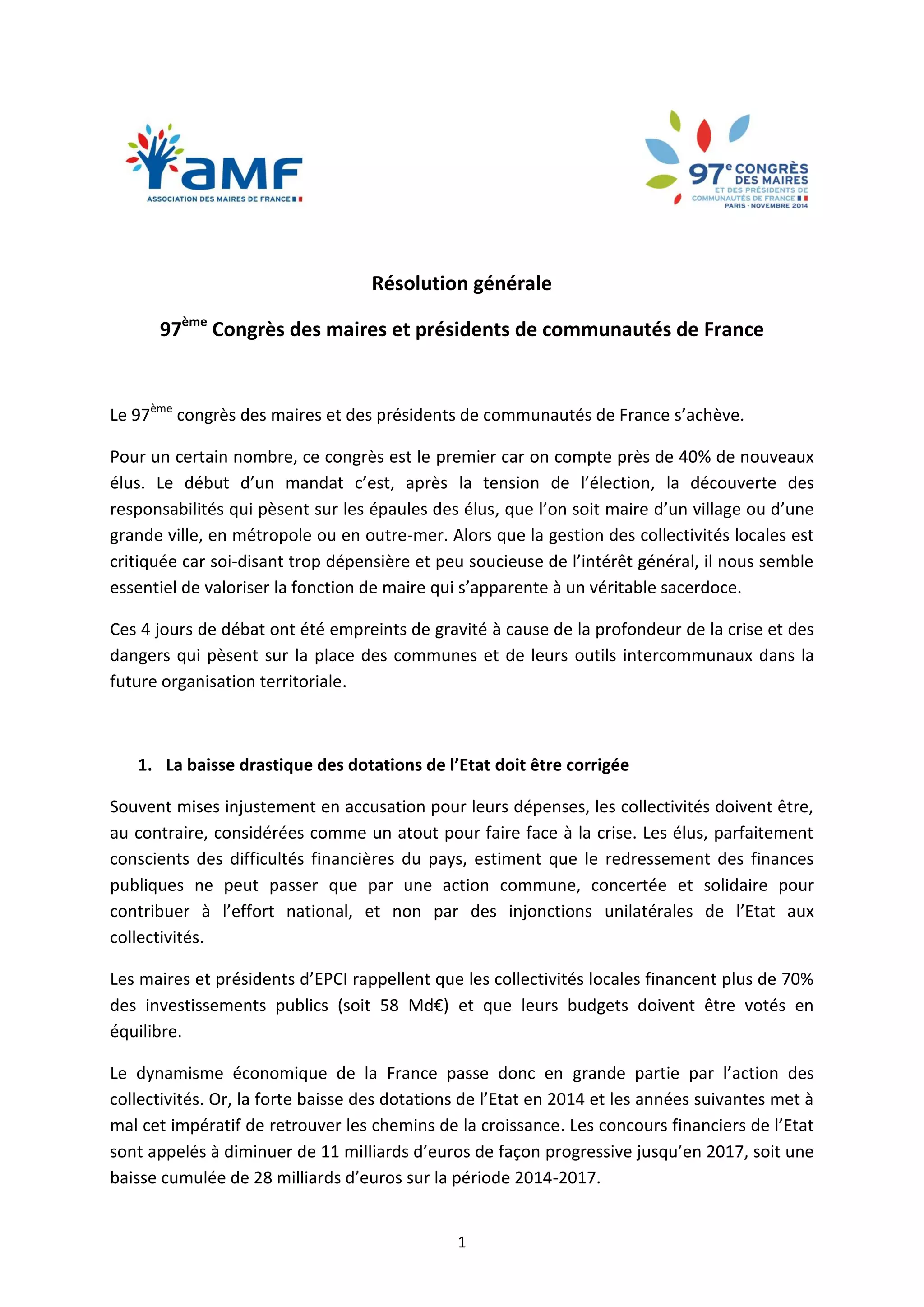 Le 97ème congrès des maires et présidents de communautés de France souligne l'importance des collectivités locales face à la baisse des dotations de l'État, appelant à une reconnaissance de leur rôle stratégique dans la relance économique et la cohésion sociale. Les élus expriment leur inquiétude face à la diminution de l'investissement public et à la menace sur les services essentiels, tout en demandant plus de liberté et de soutien dans l'organisation territoriale. Ils exigent également un dialogue urgent avec l'État pour garantir les capacités d'action des communes dans un contexte de crise croissante.