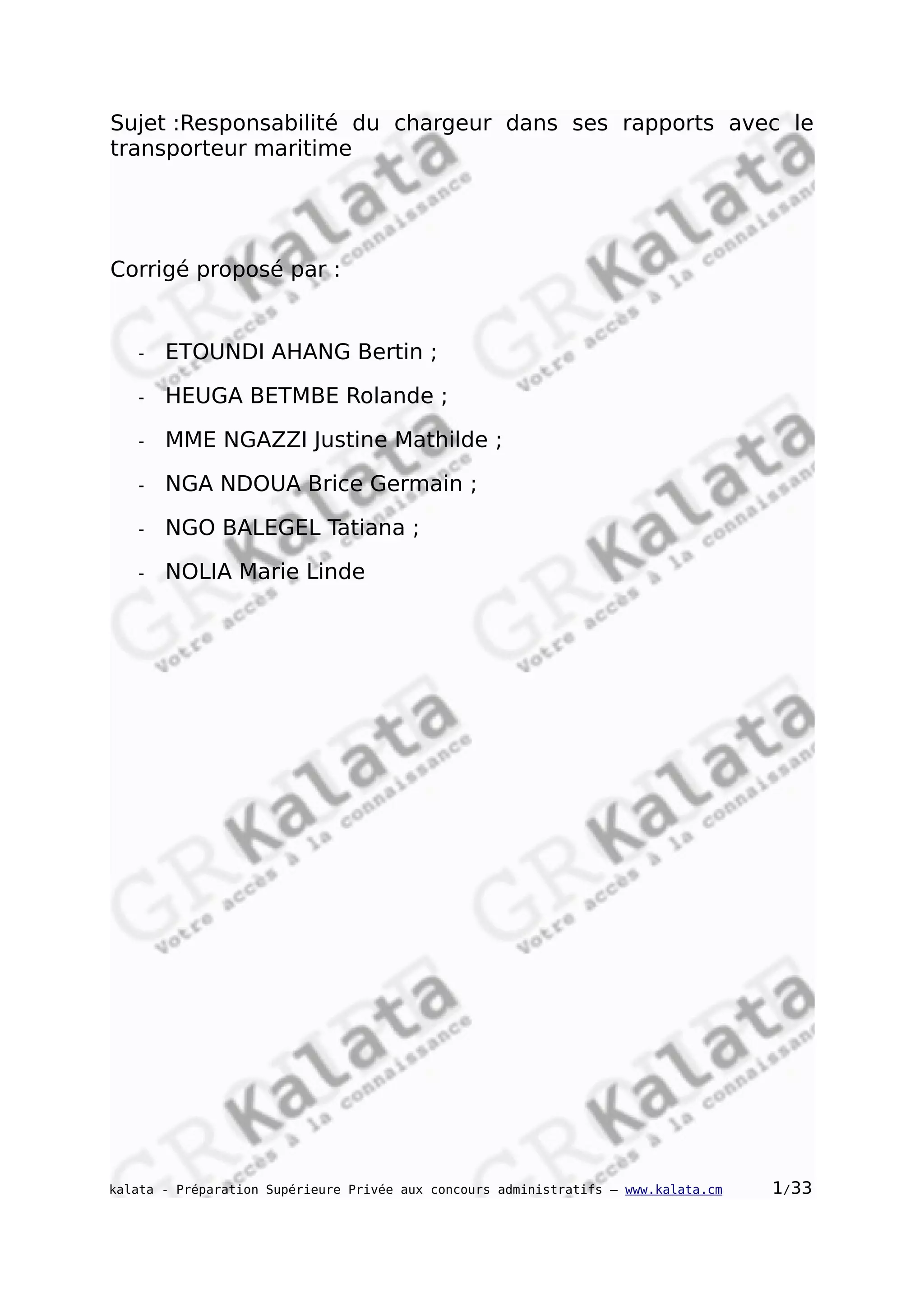 Le document traite de la responsabilité du chargeur envers le transporteur maritime, examinant tant les fondements juridiques que les implications pratiques de cette responsabilité. Il approche la responsabilité pour faute, tant contractuelle qu'extracontractuelle, et discute des obligations du chargeur, des cas de responsabilité sans faute, et de la possibilité d'une limitation de responsabilité. Le texte souligne l'importance du transport maritime dans le commerce international et les devoirs réciproques des parties impliquées.