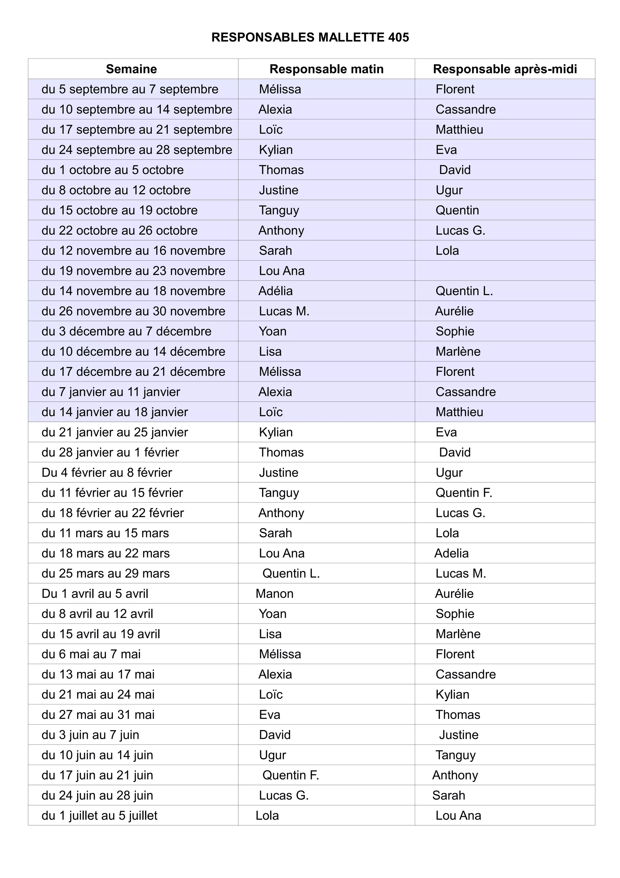 Le document présente un calendrier de responsabilité pour la mallette 405, indiquant les personnes responsables du matin et de l'après-midi pour chaque semaine de septembre à juillet. Chaque semaine est assignée à un ou plusieurs responsables, comme Mélissa, Alexia, et Thomas. Le programme inclut des périodes spécifiques pour chaque individu, s'étalant sur plusieurs mois.