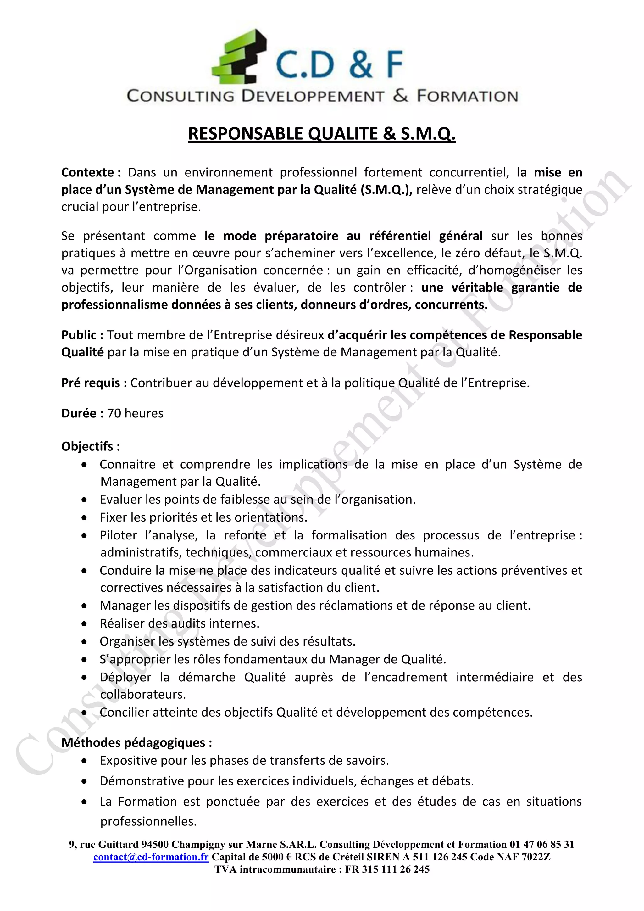 Le document décrit la mise en place d'un système de management par la qualité (SMQ) comme une stratégie essentielle pour améliorer l'efficacité et la satisfaction client dans un environnement concurrentiel. Il présente un programme de formation de 70 heures, portant sur les principes fondamentaux, l'engagement dans une démarche d'amélioration, et l'implication des collaborateurs dans l'application du SMQ. Le contenu inclut des éléments théoriques et pratiques pour évaluer, gérer et auditer les processus au sein de l'organisation.