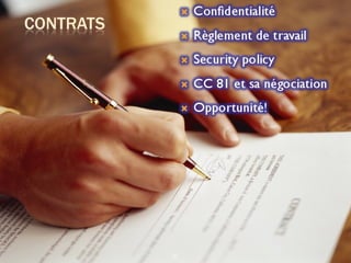 Le document explore les enjeux des ressources humaines en lien avec les nouvelles technologies et le traitement des données personnelles. Il définit des concepts clés comme les données personnelles, le traitement et le responsable de traitement, tout en détaillant les responsabilités, la sécurité juridique, et les défis associés au télétravail et aux médias sociaux. Les implications pour les RH incluent le contrôle des informations des employés et la gestion des risques liés à la sécurité des données.