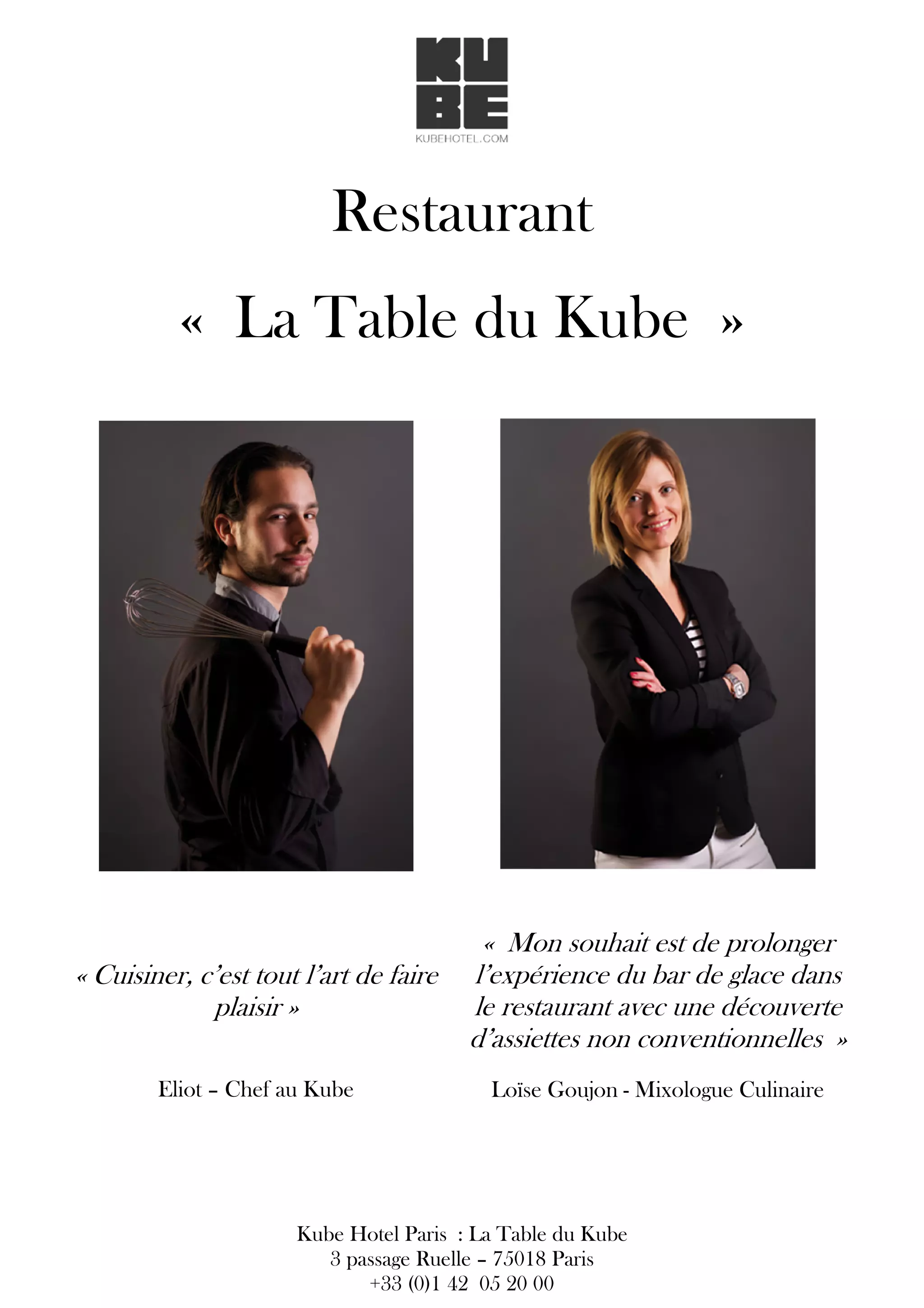 Le document présente le restaurant 'La Table du Kube' à Paris, en mettant l'accent sur la philosophie du chef Eliot et du mixologue culinaire Loïse Goujon. Il décrit plusieurs déclinaisons de plats et de cocktails avec des prix, soulignant l'approche innovante de la cuisine. Les combinaisons de saveurs et les présentations non conventionnelles sont particulièrement mises en avant.