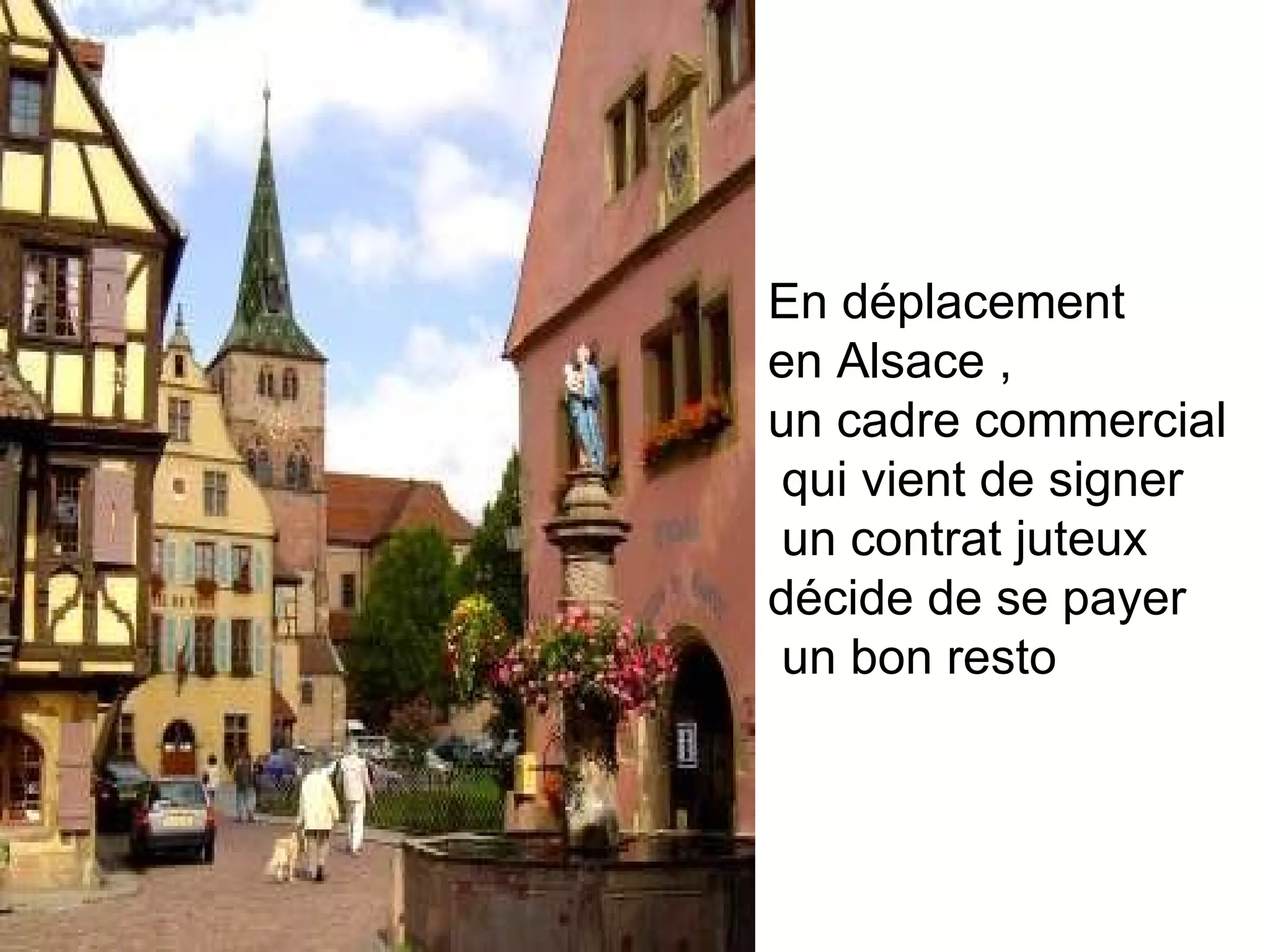 Un cadre commercial en Alsace profite d'un repas extravagant dans un restaurant, mais est surpris de découvrir que l'addition ne s'élève qu'à 3,50 euros. Les prix dérisoires sont révélés par le maître d'hôtel qui explique que son patron n'est pas là et qu'il réduit les prix. La situation absurde met en évidence l'humour et l'ironie de la dynamique employé-patron.