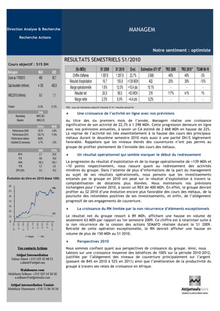 Pour le premier semestre 2010, Managem a réalisé un chiffre d'affaires de 1 298 MDH, avec une croissance de 22,7% par rapport à l'année précédente, mais a été limité par la non récurrence d'éléments exceptionnels. Le résultat net a atteint 89 MDH, augmentant de 63 MDH par rapport au S1 2009, et les prévisions de bénéfices pour 2010-2012 sont optimistes avec une attente de croissance de 100%. Les résultats sont soutenus par la hausse des prix des métaux et des investissements projetés.