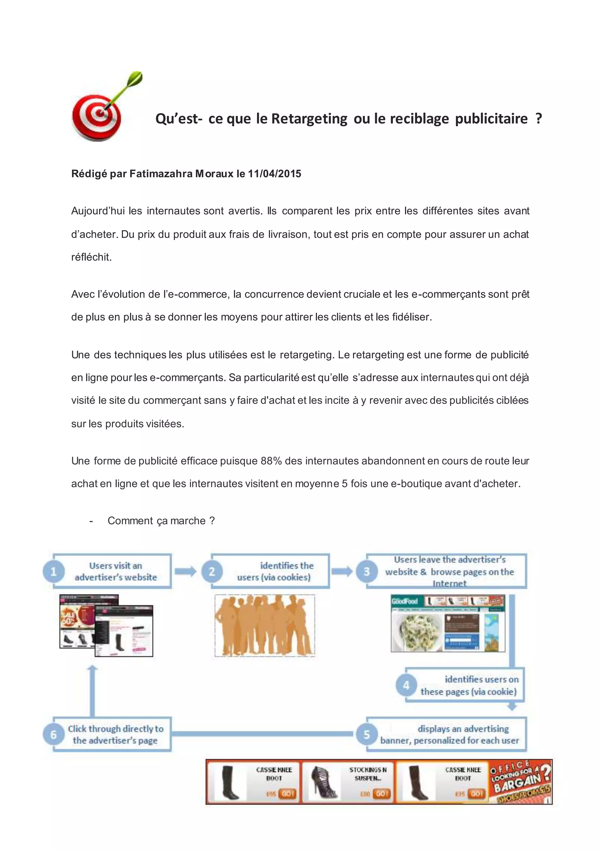 Le document décrit l'importance croissante du retargeting dans l'e-commerce, qui vise à inciter les internautes ayant abandonné leur achat à revenir sur le site avec des publicités ciblées. Il explique que cette technique utilise des cookies pour suivre la navigation des utilisateurs et leur afficher des annonces personnalisées. Le défi principal réside dans l'envoi du bon message à la bonne personne, en utilisant des algorithmes de recommandation et de machine learning.