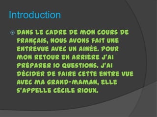 L'auteur partage son expérience d'une entrevue réalisée avec sa grand-mère, Cécile Rioux, à travers une série de dix questions explorant sa vie. Les réponses révèlent des aspects personnels tels que sa famille, son éducation, ses voyages et ses rêves. L'auteur conclut en exprimant son espoir que le lecteur a apprécié cette entrevue.