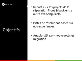 Le document traite des implications de l'utilisation d'AngularJS dans le développement de projets, notamment la séparation entre le front-end et le back-end, tout en proposant des solutions basées sur l'expérience. Il aborde également les nouveautés d'AngularJS 2.0, les bonnes pratiques à adopter, et l'organisation des projets dans le contexte des microservices et de la méthodologie DevOps. Enfin, le document évoque des outils de test et de développement qui facilitent la création d'applications modernes performantes.