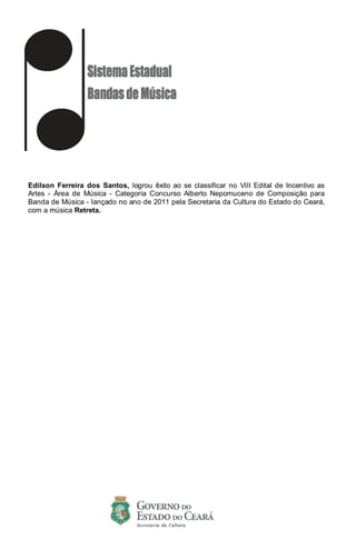 Edilson Ferreira dos Santos a remporté le concours Alberto Nepomuceno de composition pour la musique de bande avec sa pièce 'Retreta' en 2011. La partition a été publiée par la Secretaria da Cultura do Estado do Ceará en avril 2012 et comprend des arrangements pour divers instruments de musique. Le document fournit des notations musicales détaillées pour interpréter la composition.