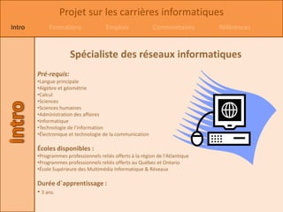Le document présente un projet sur les carrières informatiques, détaillant plusieurs professions telles que spécialiste des réseaux informatiques, webmestre, concepteur ou développeur web, informaticien et analyste de logiciel. Chaque métier est accompagné des pré-requis, des écoles disponibles, de la durée d'apprentissage et des salaires annuels. Les préférences personnelles de l'auteur révèlent un désintérêt pour ces carrières, exprimant un souhait d'explorer un domaine différent comme la psychologie.