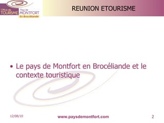 Le document présente la stratégie de développement de l'office de tourisme du Pays de Montfort en Brocéliande, axée sur l'amélioration de sa visibilité en ligne et le soutien à ses partenaires. Une première phase de développement touristique a été lancée, suivie d'une mise à jour pour définir les axes prioritaires et renforcer la présence sur Internet. Le projet comprend la refonte du site web, le développement de l'accès mobile et l'utilisation des réseaux sociaux pour promouvoir la destination.