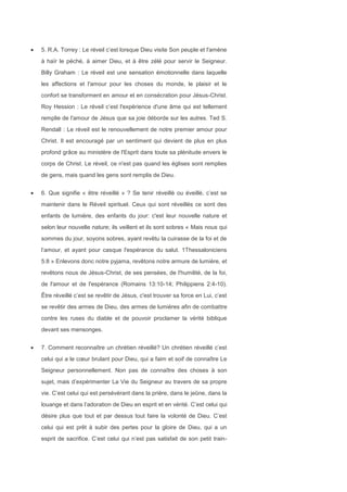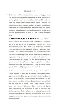 Ce document évoque l'importance du réveil spirituel chez les chrétiens, soulignant que celui-ci doit commencer par une prise de conscience individuelle et collective au sein de l'Église. Il décrit les caractéristiques d'un chrétien réveillé versus celui qui est endormi, en insistant sur la nécessité de la prière, de la repentance et d'une relation intime avec Dieu pour vivre pleinement sa foi. Enfin, il appelle à identifier son état spirituel et à rechercher un renouvellement constant par l'obéissance et l'humilité devant le Seigneur.