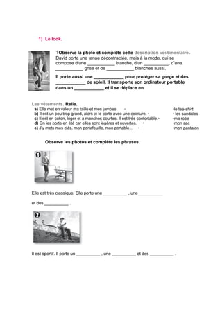 Le document présente divers exercices sur la mode, les goûts personnels, et l'utilisation des temps verbaux en français, incluant le passé composé. Il inclut des complétions de phrases, des associations de questions-réponses et des conjugaisons à plusieurs temps verbaux. Les thèmes abordés incluent l'évaluation des looks vestimentaires, l'expression des préférences et la formation de phrases négatives.