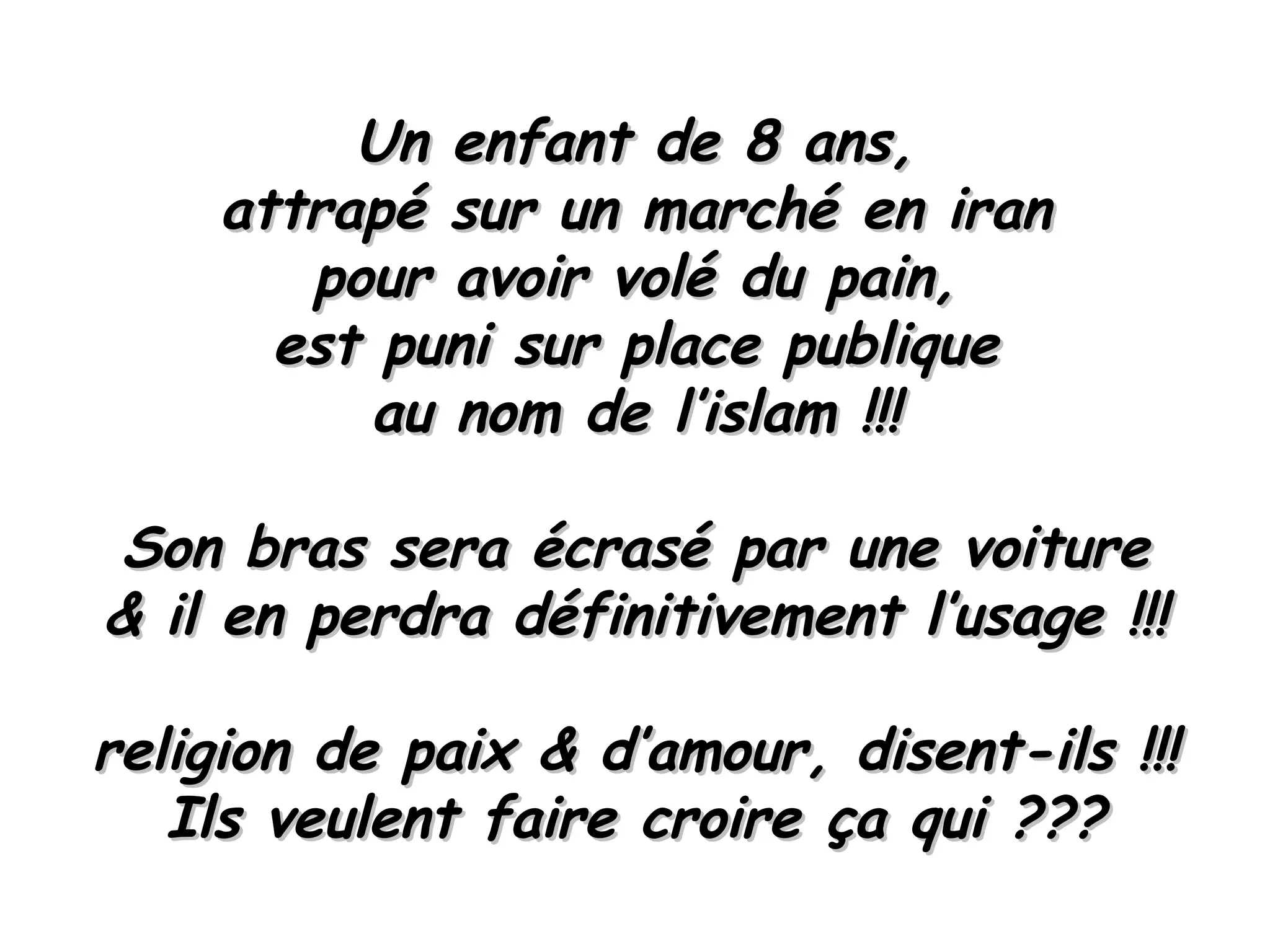 Un enfant de 8 ans a été puni publiquement en Iran pour avoir volé du pain, perdant l'usage de son bras écrasé par une voiture. Cette situation soulève des questions sur la violence justifiée au nom de la religion. Le document remet en question l'idée que certaines religions prônent la paix et l'amour.