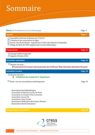 Le document aborde les vœux du président de la CRESS Martinique pour 2012, exprimant des préoccupations face à la crise économique et appelant à la solidarité au sein de l'économie sociale et solidaire. Il souligne l'importance d'accompagner les projets des associations et de lutter contre la précarité croissante. En conclusion, il encourage les acteurs de l'économie sociale à se mobiliser pour faire entendre leur voix et soutenir les plus vulnérables.