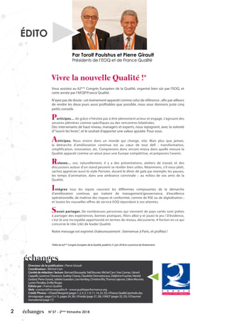Le document présente le 62ème congrès européen de la qualité qui s'est tenu à Paris, rassemblant 350 participants issus de 165 entreprises et 43 nationalités. Les messages clés portent sur l'importance de la qualité dans un monde en pleine transformation et sur des échanges enrichissants entre professionnels de divers secteurs. Ce congrès est perçu comme une opportunité unique de partage d'expériences et de meilleures pratiques dans le domaine de la qualité.